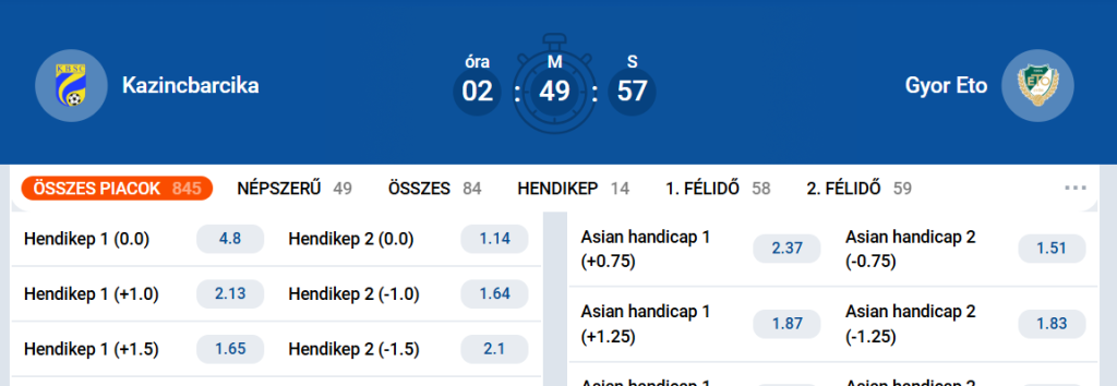 - Góllal kapcsolatos piacok: Összgólok száma (over/under), mindkét csapat szerez gólt, pontos eredmény