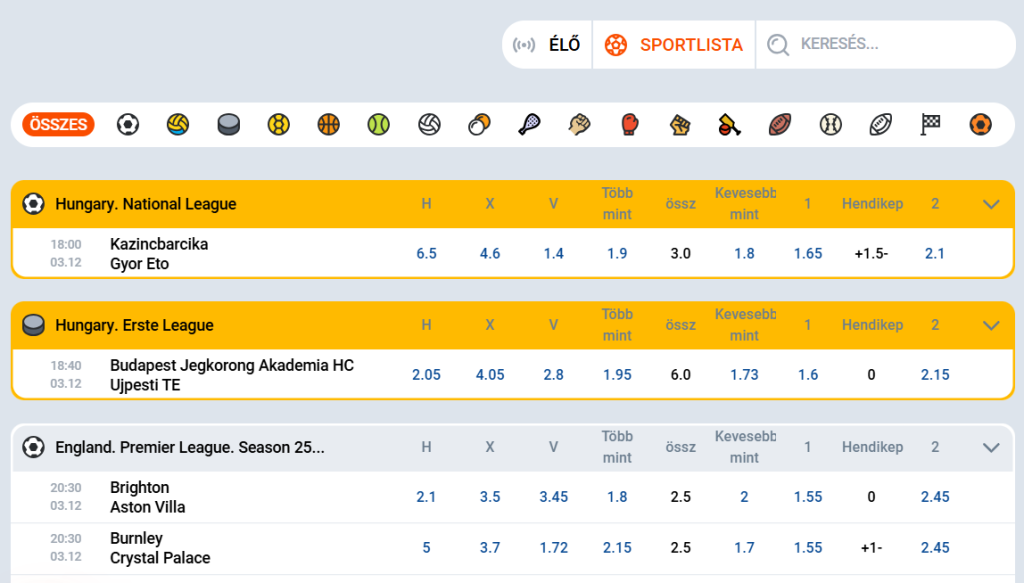A magyar játékosok számára kiemelt fontosságú, hogy a platform részletes lefedettséget biztosít a hazai bajnokságokról. Az NB I mérkőzésekre akár 200+ fogadási piac is elérhető, beleértve a gólszerzőket, szögleteket, sárga lapokat és egyéni játékos teljesítményeket. A nemzetközi események között megtalálhatók a Bajnokok Ligája, Premier League, La Liga, NBA, NHL és ATP tenisztornák.