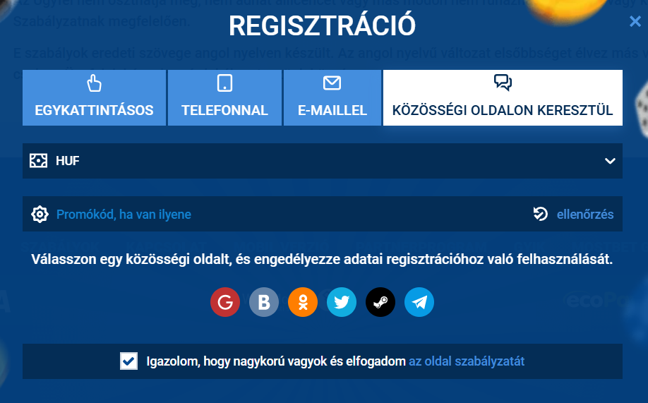 A regisztráció során lehetőség van promóciós kód megadására is, amely növeli az üdvözlő bónusz mértékét. A feltételek elfogadása kötelező – ezzel a játékos megerősíti, hogy 18 éven felüli, és elfogadja az adatvédelmi irányelveket.